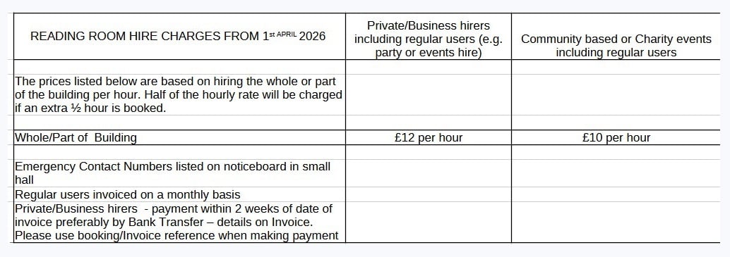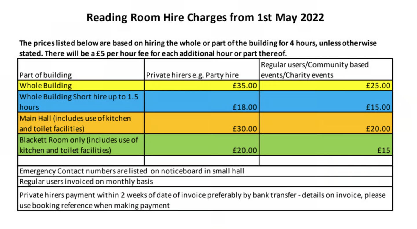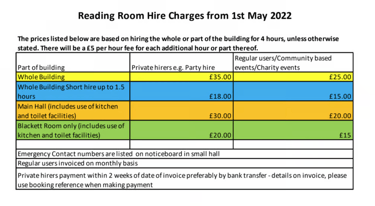 bookingreadingroom@gmail.com There are special rates for charity functions and regular users.